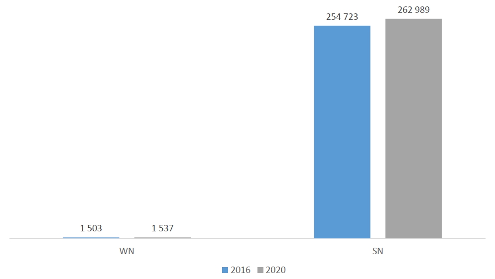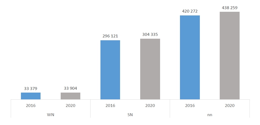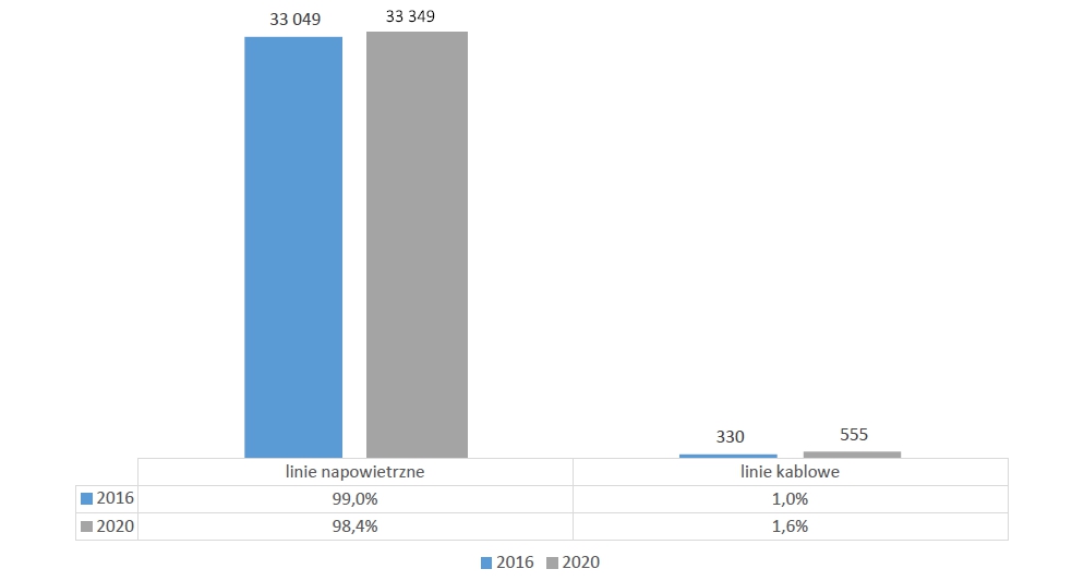 Na rysunku 1 pokazano długości linii elektroenergetycznych z podziałem na napięcia. Jak widać, w sieci dystrybucyjnej najdłuższe są linie niskiego napięcia, a najkrótsze linie wysokiego napięcia. Porównując lata 2016 i 2020, na każdym poziomie napięcia nastąpił wzrost długości linii, z czego największy miał miejsce dla linii niskiego napięcia (rys. 2).