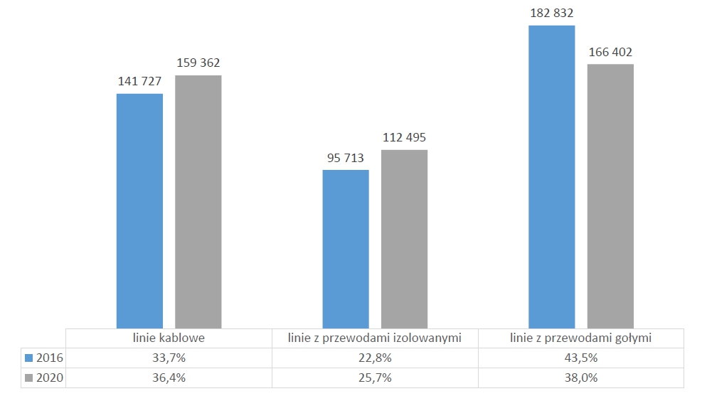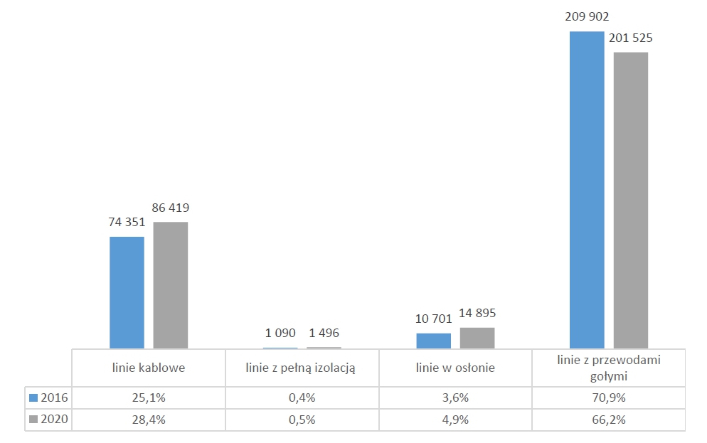 Podobnie jak w przypadku linii SN, linie elektroenergetyczne niskiego napięcia budowane są jako linie kablowe lub linie z przewodami izolowanymi. W analizowanym okresie nastąpił wzrost długości linii o prawie 18 tys. km. W tym samym czasie zlikwidowano ponad 16 tys. linii z przewodami gołymi. Mimo tych działań największy udział w ramach linii nn na koniec 2020 roku miały linie z przewodami gołymi – 38 proc.