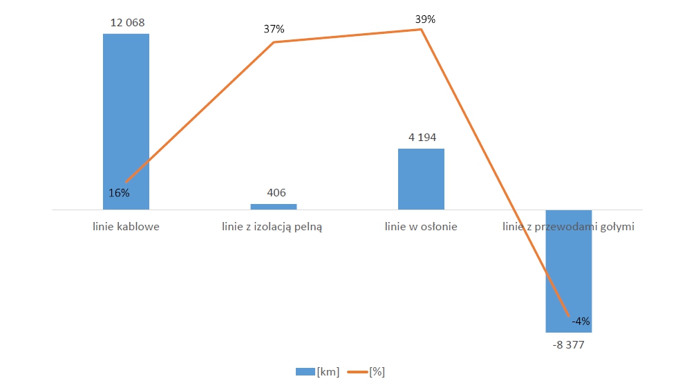 Zmiany w latach 2016-2020 w zakresie długości poszczególnych typów linii SN pokazano na rysunku 5. Największa to wzrost długości linii kablowych o ponad 12 tys. km i likwidacja przeszło 8 tys. km linii napowietrznych z przewodami gołymi. Zauważalne jest jeszcze ponad 4 tys. km nowych linii napowietrznych z przewodami w osłonie. Największe procentowe zmiany dotyczą linii izolowanych, ale wynika to ze zdecydowanie mniejszego wolumenu tego typu linii. Efektem działań OSD jest wzrost w stosunku do 2016 roku o 3,3 p.p. udziału linii kablowych, który na koniec 2020 roku wyniósł 28,4 proc.
