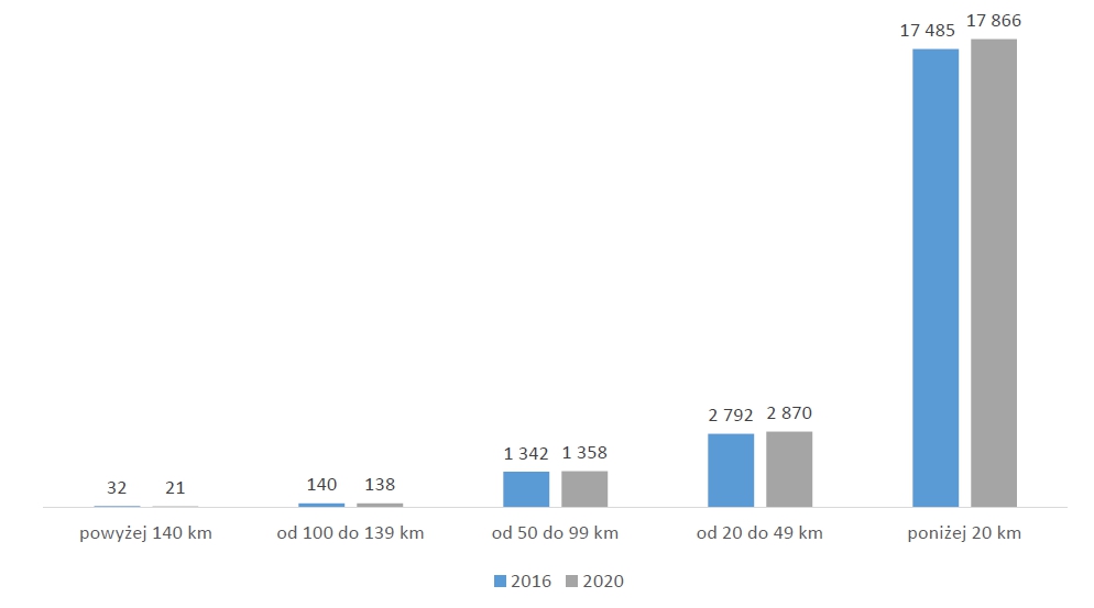 Elementem poprawy niezawodności zasilania jest również skracanie długości ciągów liniowych SN. Z przedstawionych na rysunku 6 danych wynika, że w analizowanym okresie nastąpiło zmniejszenie najdłuższych ciągów. Jednocześnie nowo budowane linie charakteryzują się ciągami liniowymi poniżej 20 km. Na koniec 2020 roku stanowiły one 80,3 proc. wszystkich ciągów.