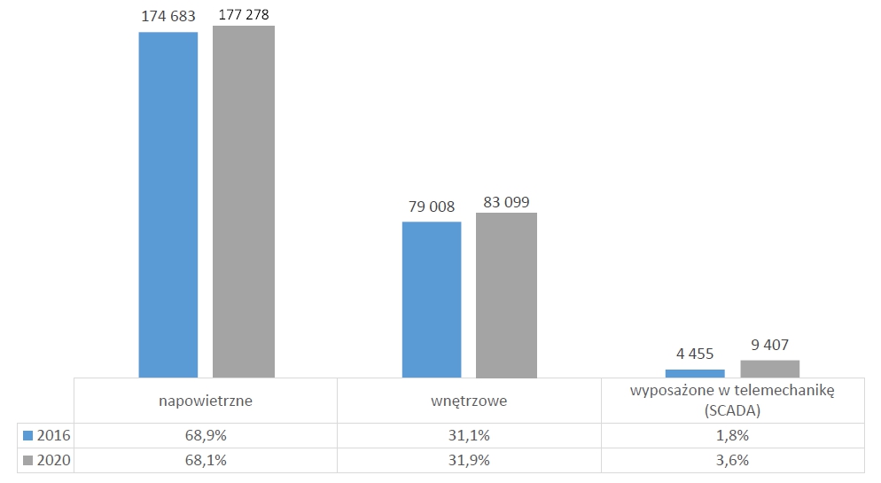 Jednymi z najważniejszych elementów sieci dystrybucyjnej, mającymi fundamentalne znaczenie dla jej funkcjonowania, są stacje elektroenergetyczne wysokiego napięcia, czyli tzw. Główne Punkty Zasilające. W 2020 roku takich stacji było 1537, o 34 więcej niż w 2016 roku. Znacznie większą grupą stacji są jednak stacje średniego napięcia, które ze względu na rolę, jaką pełnią w sieci, możemy podzielić na stacje SN/nn i stacje SN/SN.