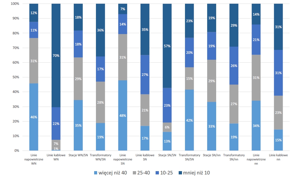 Z perspektywy kilku lat widać starzejące się linie napowietrzne SN, co jest wynikiem tego, że remontowane linie odtwarzane są najczęściej jako linie kablowe. Tylko 7 proc. linii napowietrznych do 10 lat i jednocześnie 48 proc. w wieku powyżej 40 lat (o 12 p.p. więcej niż w 2016 roku) jest najgorszym wynikiem spośród prezentowanych elementów sieci. Zupełnie odwrotnie jest w przypadku linii kablowych SN – coraz więcej jest nowych linii i coraz mniej tych w wieku powyżej 40 lat. Mimo że coraz więcej budowanych jest linii kablowych SN, to infrastruktura kablowa odmładza się bardzo wolno. Od 2016 roku o 5 p.p. wzrósł udział linii kablowych SN, które mają poniżej 10 lat.
